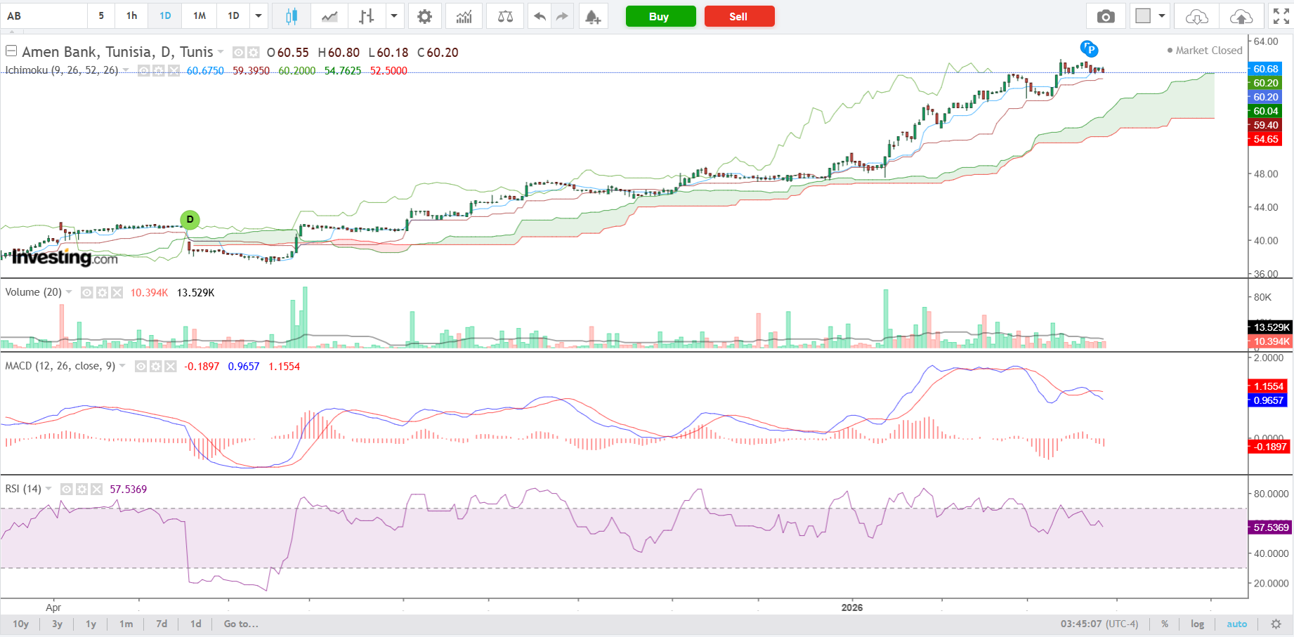 Sur le plan de l’analyse graphique, la configuration de l’action demeure résolument haussière. Le titre évolue avec une marge de sécurité confortable au-dessus du nuage Ichimoku, validant une tendance de fond solide. Cette dynamique est corroborée par des indicateurs de momentum favorables : un RSI à 57,53 qui laisse encore du potentiel avant la zone de surachat, et un MACD évoluant en territoire positif, suggérant une poursuite possible de l’ascension vers de nouveaux sommets.