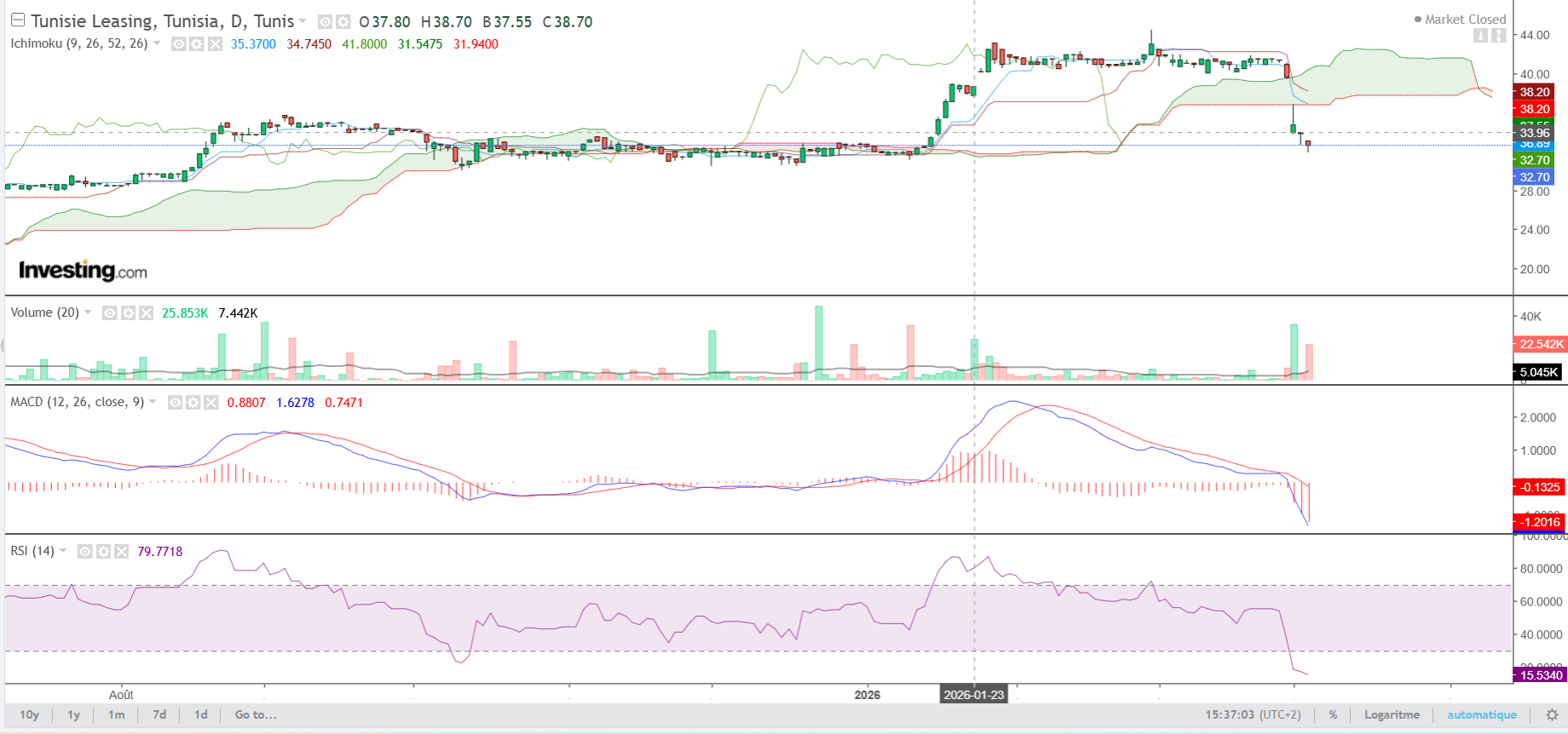 - Ichimoku : Le prix a violemment cassé le nuage (Kumo) par le bas. La tendance haussière est officiellement neutralisée. La zone des 35,37 TND (bas du nuage) devient maintenant une résistance majeure.