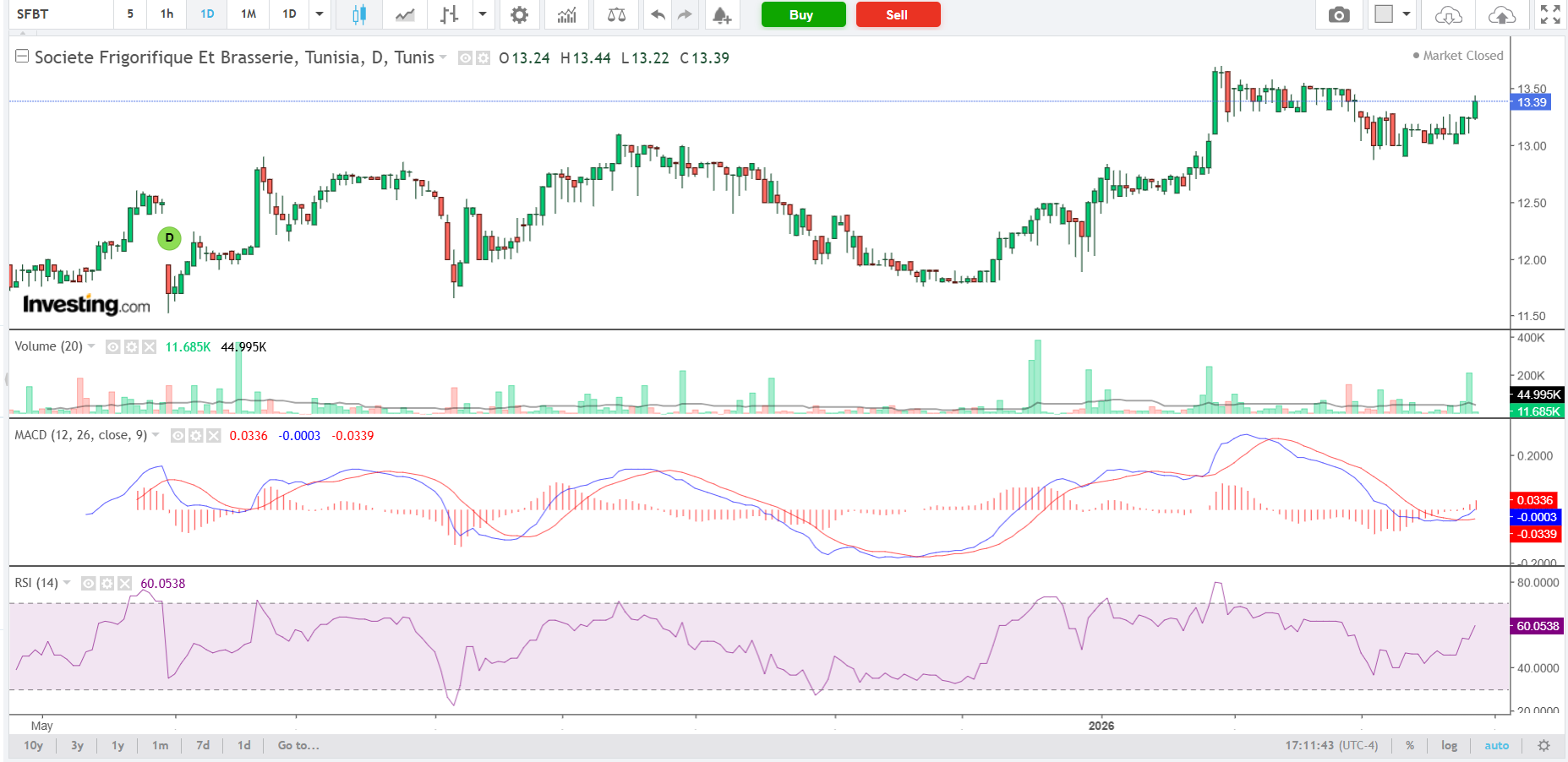 La Société de Fabrication des Boissons de Tunisie (SFBT) a publié ses indicateurs annuels suite à la réunion de son Conseil d’Administration du 27 mars 2026. Ces résultats, marqués par une progression de la rentabilité, interviennent alors que le titre affiche une configuration graphique dynamique à l’approche de son échéance annuelle.