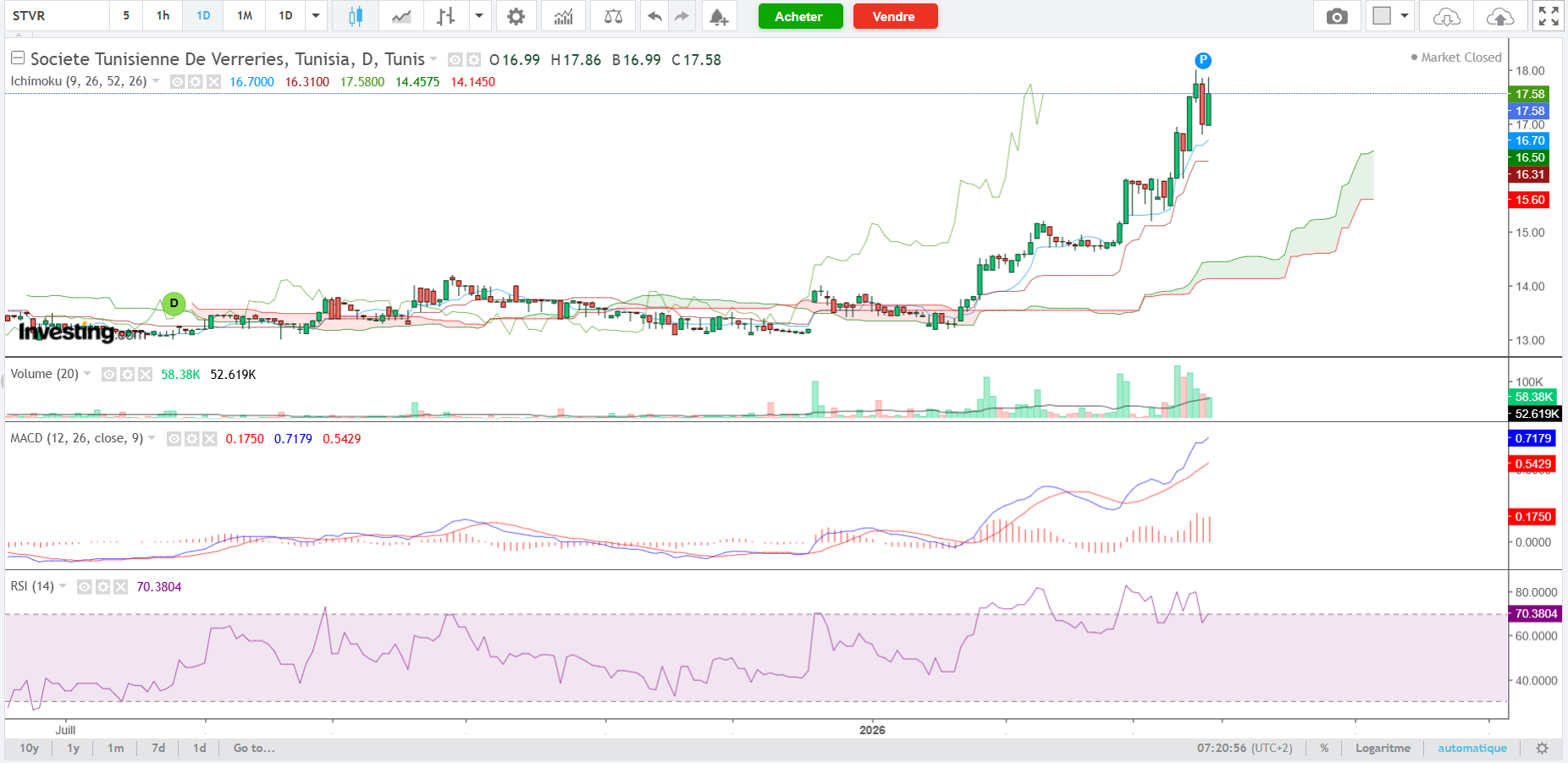 SOTUVER demeure l’une des valeurs les plus résilientes du marché tunisien, portée par ses performances à l’export. Pour l’investisseur actif, la zone actuelle demande une gestion rigoureuse des stop-loss. Un retour sur les supports de 16,50 – 16,70 TND pourrait offrir des points d’entrée plus attractifs pour viser le long terme.
